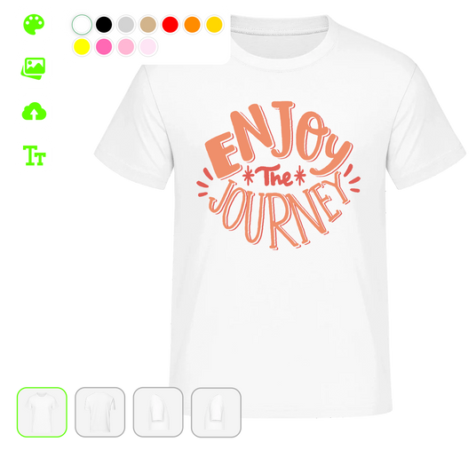 Wähle die T-Shirt-Farbe, füge Text oder ein Bild hinzu, oder nutze eines der vorgefertigten Designs.